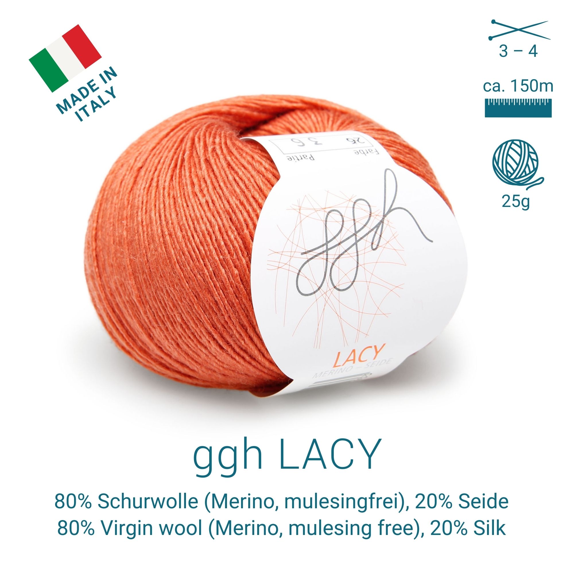 02 - Einzelgarn mit Herkunft.jpgGGH Lacy | Merinowolle mit Seide | 25g – 170m | 026 – Herbstorange