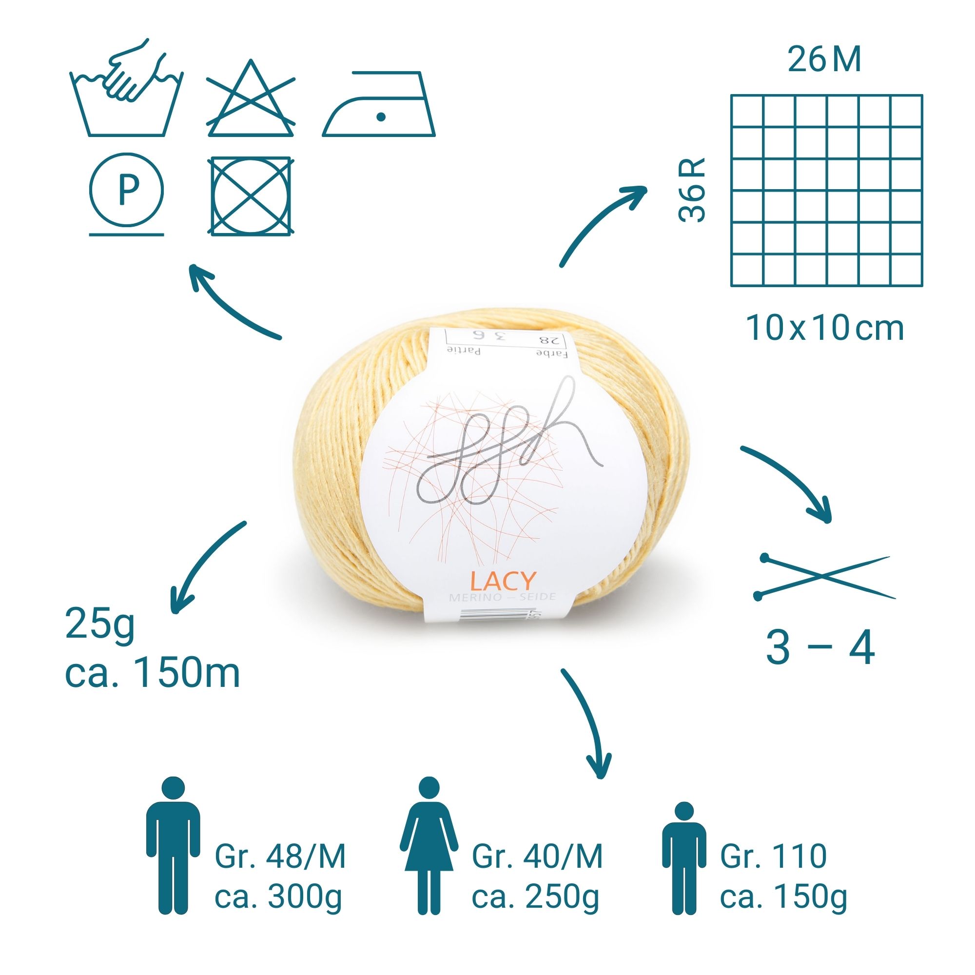 Ob für zarte Lace-Muster, leichte Pullover oder elegante Accessoires, “ggh Lacy” bietet Strickbegeisterten die Möglichkeit, mit einer außergewöhnlichen Garnqualität zu arbeiten, die jedes Projekt zu einem Kunstwerk werden lässt. Es ist die ideale Wahl für diejenigen, die in ihren Handarbeiten einen Ausdruck von Luxus und Qualität suchen, ohne dabei Kompromisse bei der Funktionalität und dem Tragekomfort einzugehen.